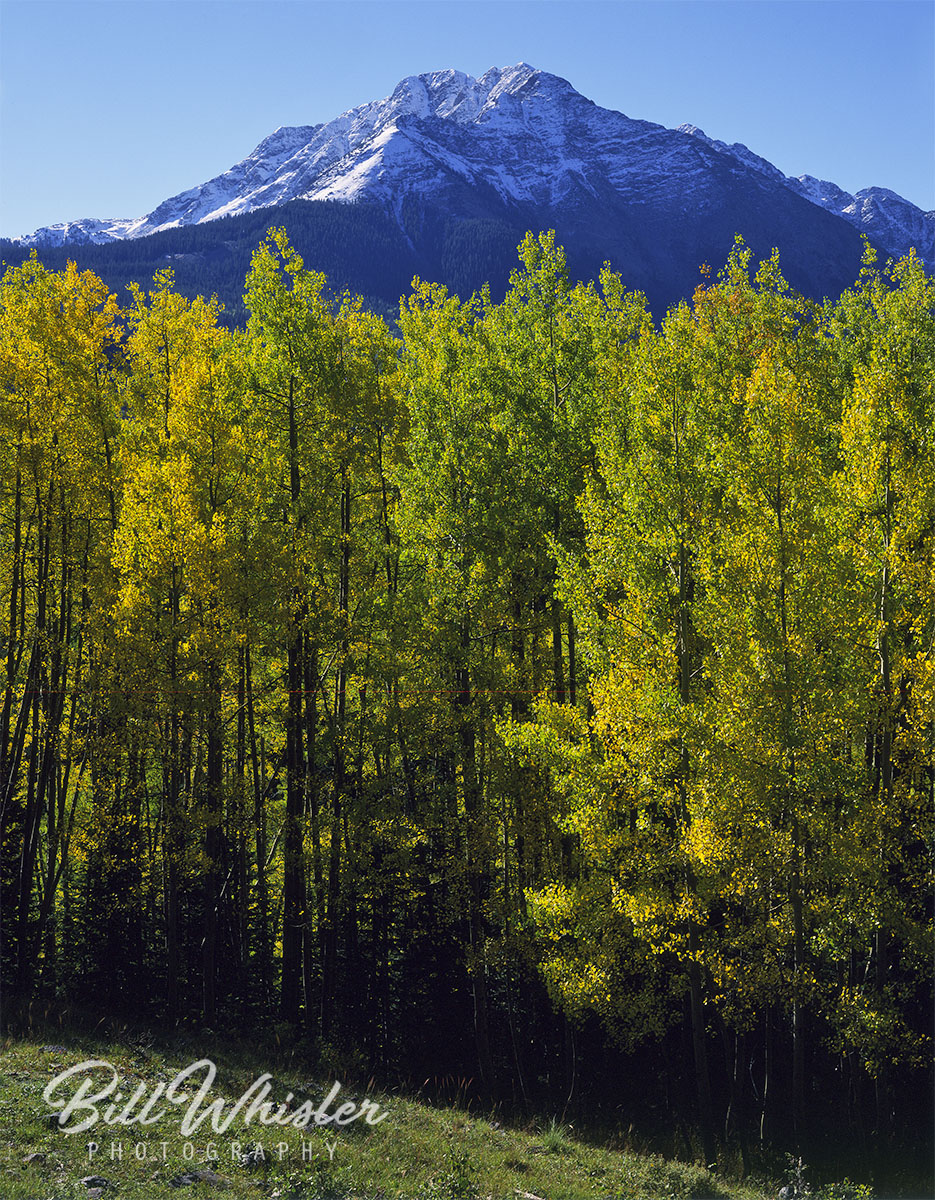 Spring and autumn are great times to photograph the area of Lime Creek in San Juan County. The lime green color of the aspen forest is amazing. In autumn the leaves are a brilliant yellow/gold and sometimes red with the rising mountain peaks in the background.